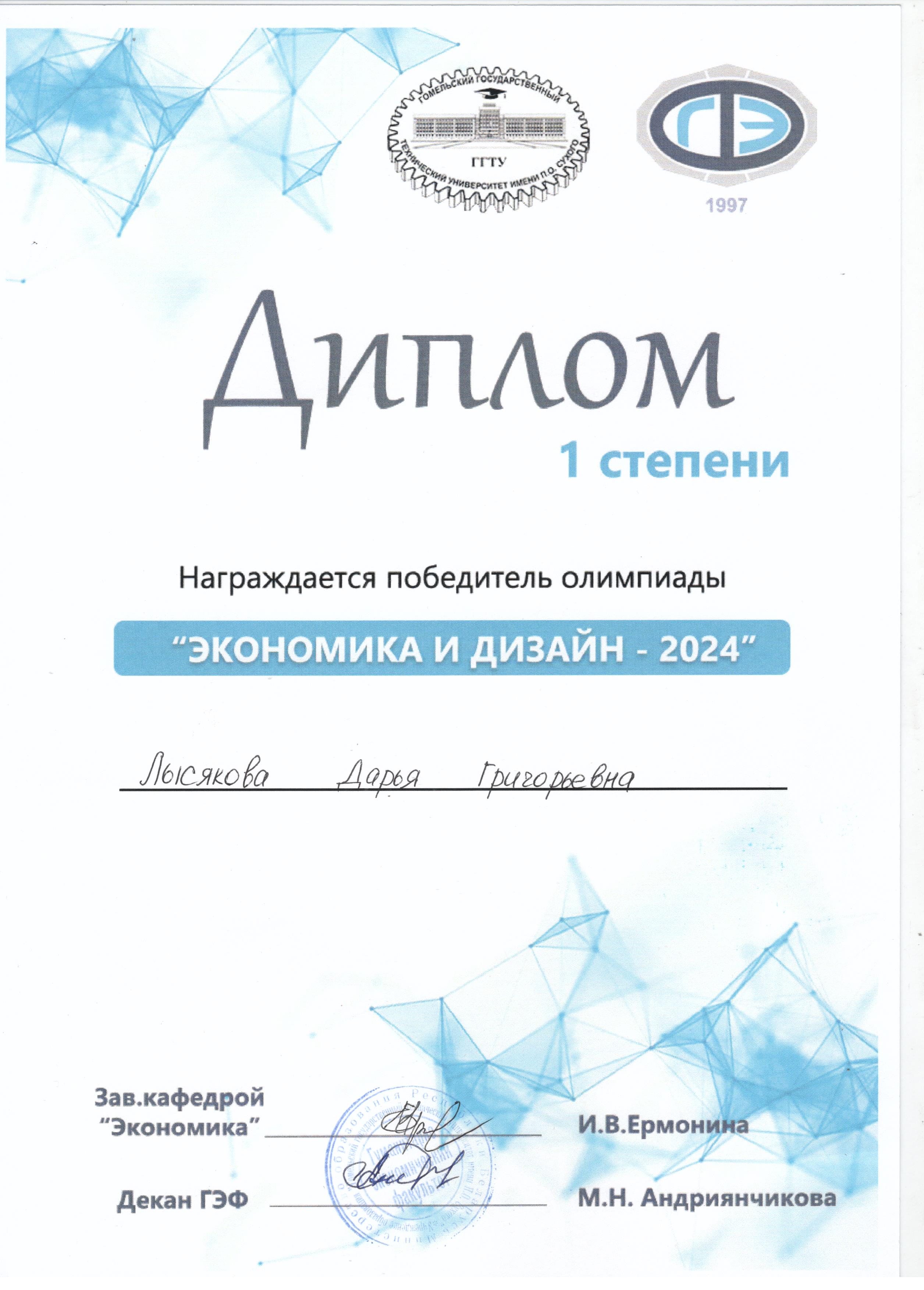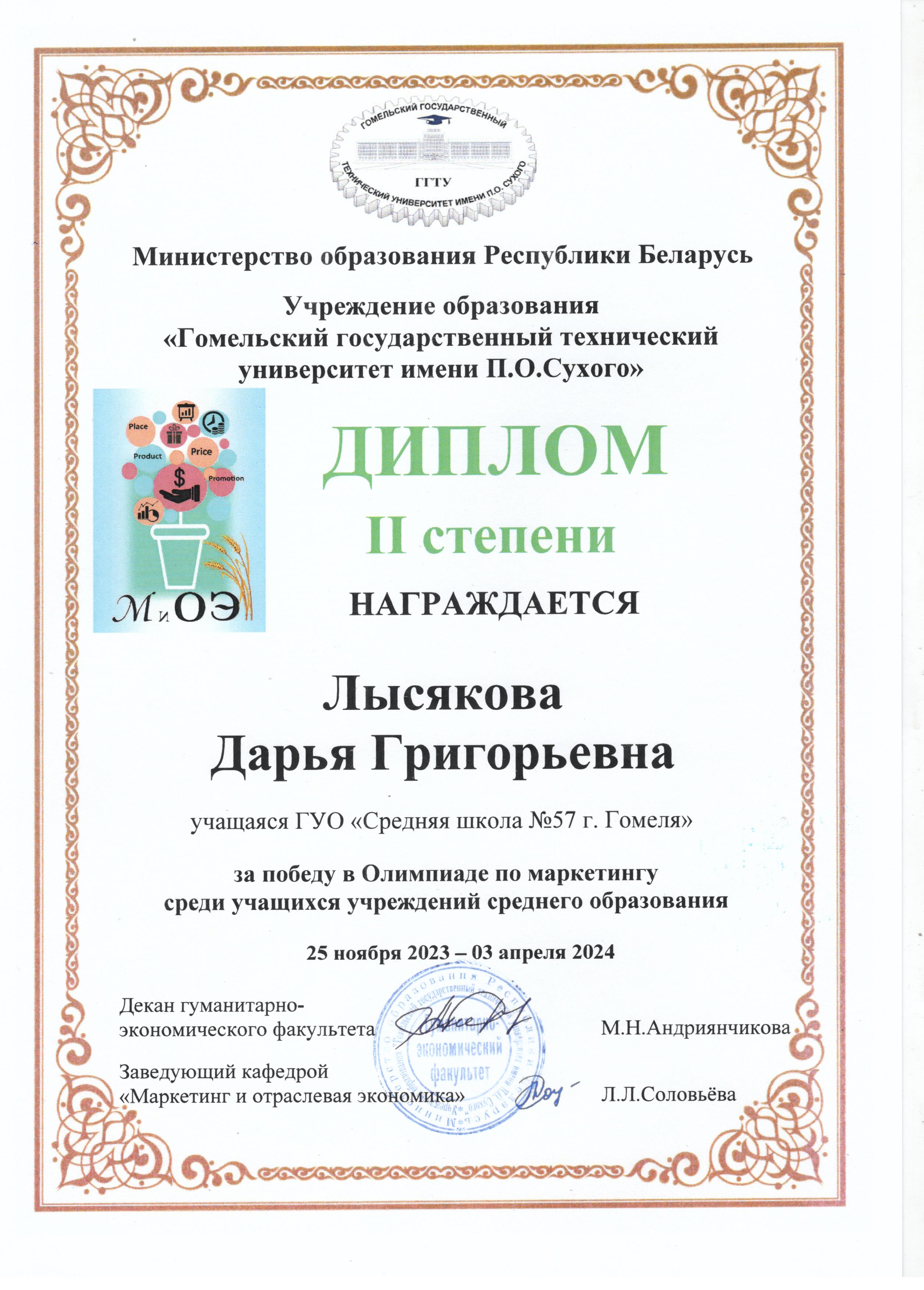 6 апреля 2024 года в Гомельском государственном техническом университете имени П.О. Сухого прошел День открытых дверей. На этом мероприятии для награждения были приглашены учащиеся и их руководители, принявшие участие в олимпиаде по маркетингу среди учащихся учреждений среднего образования и в олимпиаде "Экономика и дизайн". Учащаяся 11 "А" класса Лысякова Дарья вместе с памятными призами получила диплом II степени в олимпиаде по маркетингу и диплом I в олимпиаде "Экономика и дизайн".